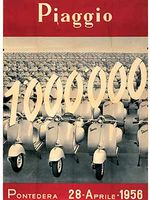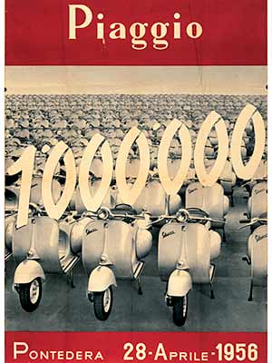 1956, also nur gerade zehn Jahre nach ihrem Entstehen, lief bereits die einmillionste Vespa vom Band. Pontedera, der kleine Ort nahe Pisa, ist längst zur "Vespa-City" geworden. Das Werkareal ist von 4800 auf 44'600 m2 angewachsen, die Mitarbeiterzahl von 136 auf knapp 7000. 1965 starb Enrico Piaggio. In den 70er Jahren hatte die Vespa mit allerhand Schwierigkeiten zu kämpfen. Europa im Autofieber begann den Roller zu vergessen und wandte sich dem Vierradvehikel zu.